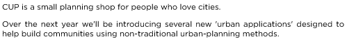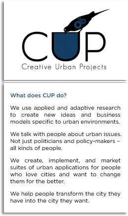 AboutWhat does CUP do?We use applied and adaptive research to create new ideas and business models specific to urban environments. We talk with people about urban issues. Not just politicians and policy-makers – all kinds of people. We create, implement, and market suites of urban applications for people who love cities and want to change them for the better. We help people transform the city they have into the city they want. |