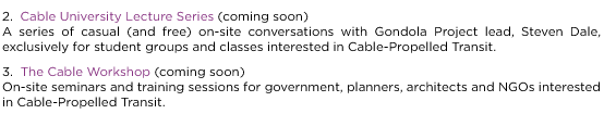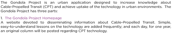 The Gondola ProjectThe Gondola Project / The Cable Car Project is an urban application designed to increase knowledge about Cable-Propelled Transit (CPT) and achieve uptake of the technology in urban environments. The Gondola Project has three parts: