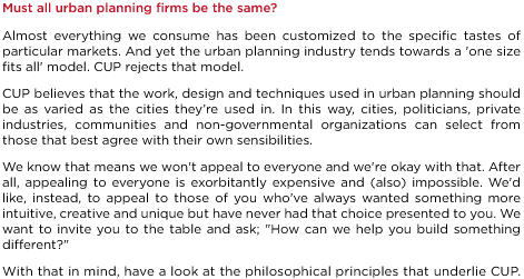 ![]() PhilosophyMust all urban-planning firms be the same?Almost everything we consume has been customized to the specific tastes of particular markets. And yet the urban planning industry tends towards a 'one size fits all' model. CUP rejects that model. CUP believes that the work, design and techniques used in urban planning should be as varied as the cities they’re used in. In this way, cities, politicians, private industries, communities and non-governmental organizations can select from those that best agree with their own sensibilities. We know that means we won't appeal to everyone and we're okay with that. After all, appealing to everyone is exorbitantly expensive and (also) impossible. We'd like, instead, to appeal to those of you who've always wanted something more intuitive, creative and unique but have never had that choice presented to you. We want to invite you to the table and ask; "How can we help you build something different?" With that in mind, have a look at the philosophical principles that underlie CUP. If they click with you, maybe we should talk.